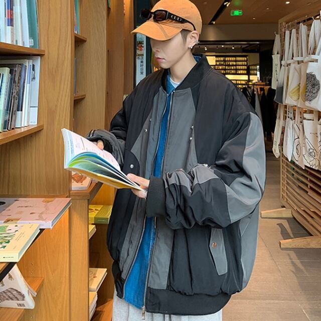 【予約販売】ブルゾン MA-1 アウター アーミー ジップアップ 無地 バイカラー グレー×ブラック 防寒 ジャケット ショート丈 メンズ カジュアル 男前 こなれ感 お洒落 韓国 トレンド 秋 冬 S/M/L/XL/2XL