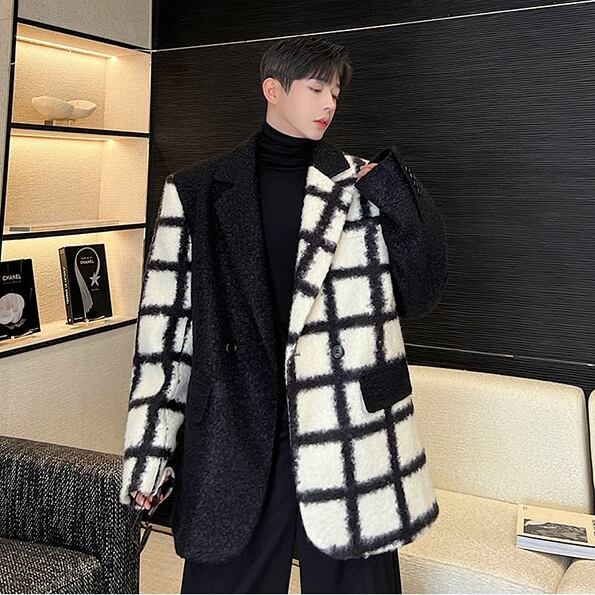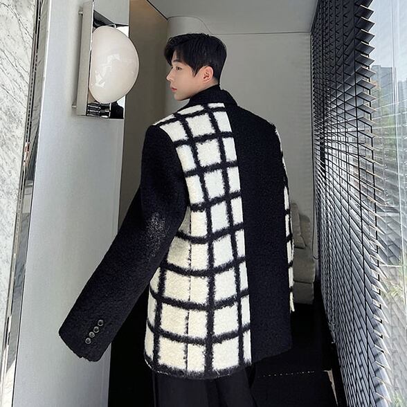 【予約販売】ジャケット 無地 個性的 メンズ ブラック 黒 ボア アシンメトリー チェック柄 ドレスアップ シック こなれ感 お洒落 韓国 トレンド 秋 冬 M/L/XL