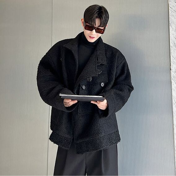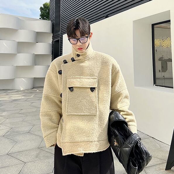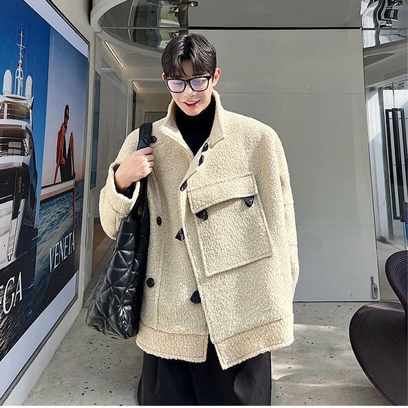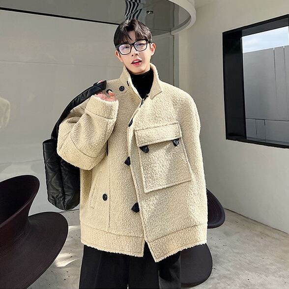 【予約販売】ブルゾン アウター ボア ポケット シンプル ハイカラー ベージュ ブラック ジャケット ショート丈 メンズ カジュアル 男前 こなれ感 お洒落 韓国 トレンド 秋 冬 M/L/XL