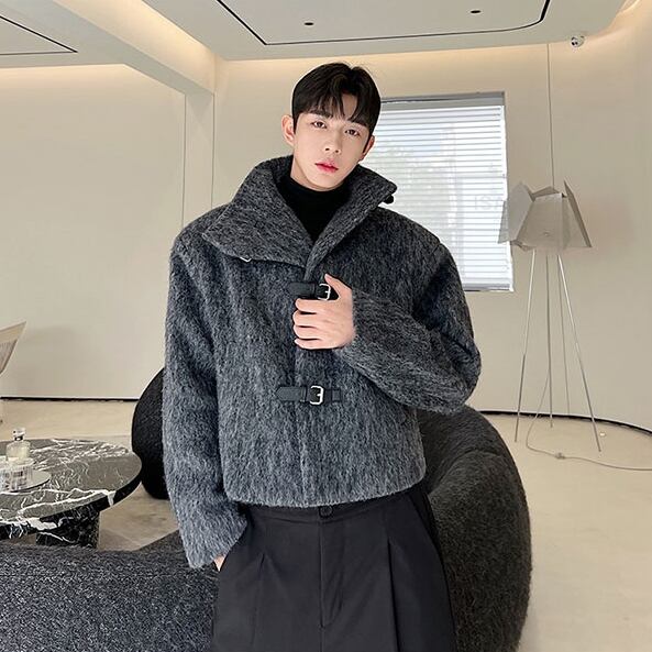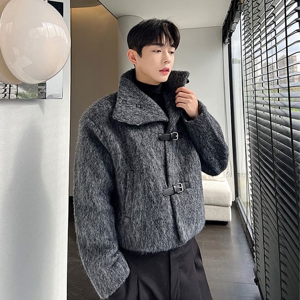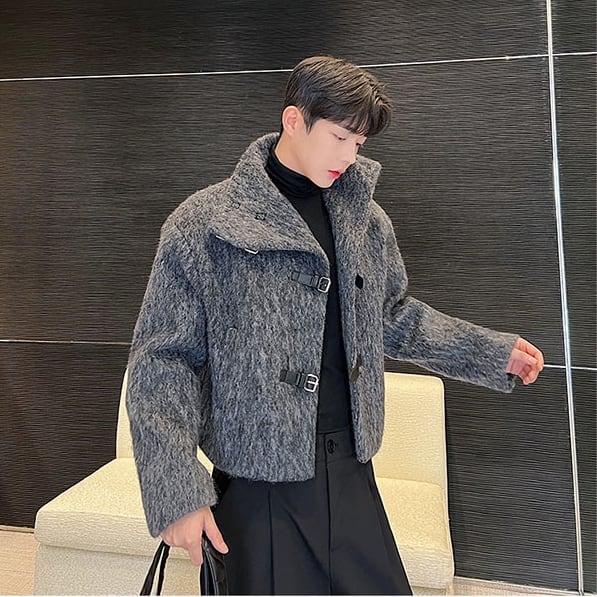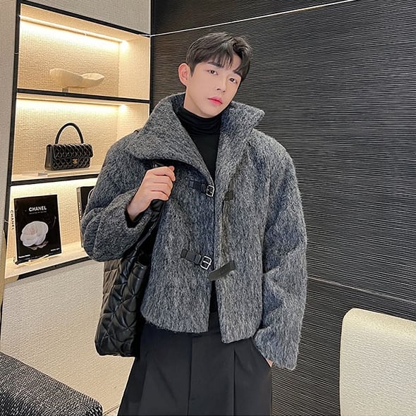 【予約販売】ジャケット ショート丈 ボア 無地 グレー ハイカラー アウター メンズ レザー カジュアル こなれ感 お洒落 韓国トレンド 秋 冬 M/L/XL