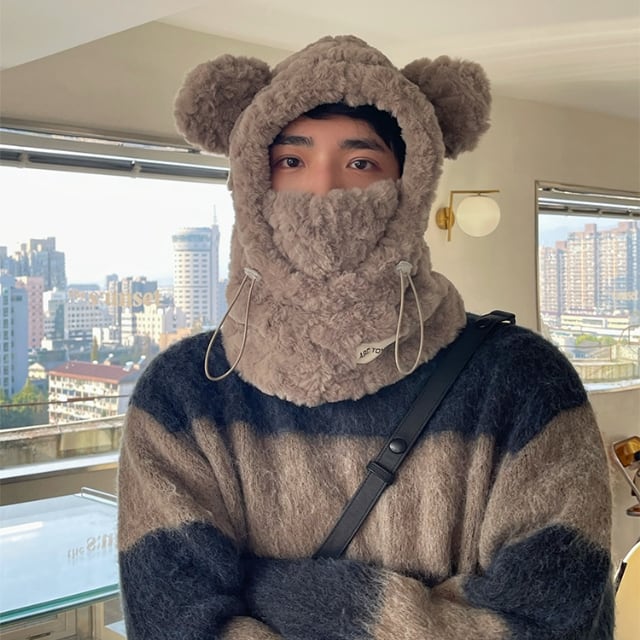 【予約販売】耳付き帽 クマ ボア バラクラバ ネックウォーマー フード フーディ イヤーウォーマー メンズ ストリート アウトドア カジュアル 防寒 ベージュ/グレー ダンス ヒップホップ こなれ感 お洒落 韓国 トレンド スキー スノボ