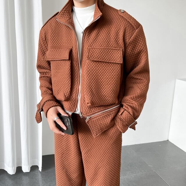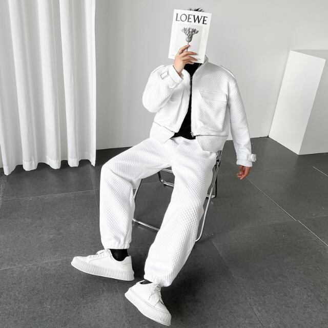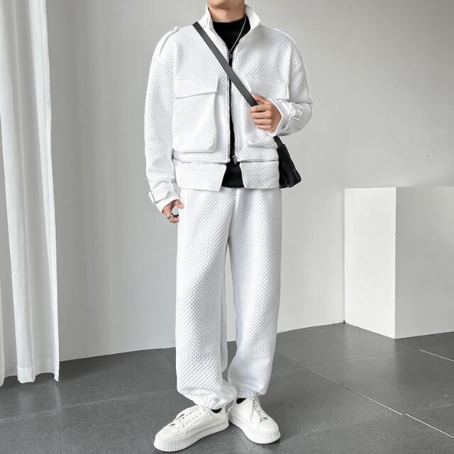 【予約販売】メンズ セットアップ 上下 パンツ 長袖 ジップアップ ワッフル 無地 ブラウン ホワイト ブラック カジュアル 春夏 韓国 トレンド こなれ感 M/L/XL/2XL