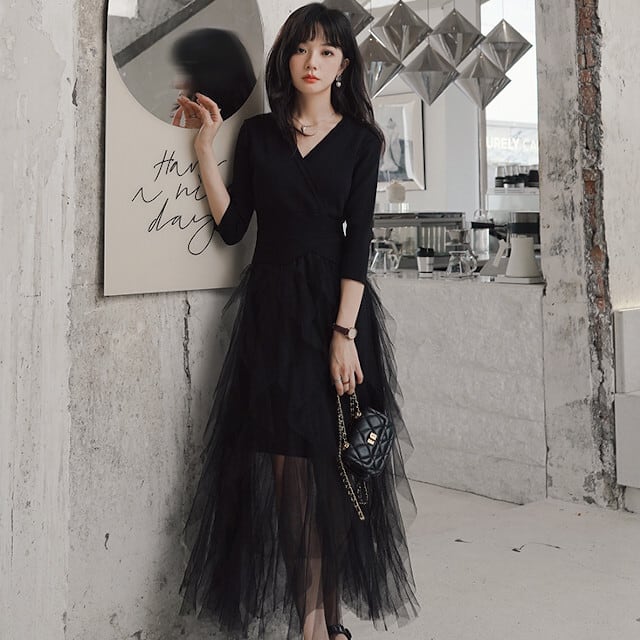 ワンピース レディース シースルー 異素材ミックス ニットワンピ ロングワンピ Vネック シック モノトーン チュール セクシー オケージョン おしゃれ かっこいい かわいい ブラック S/M/L/XL/2XL