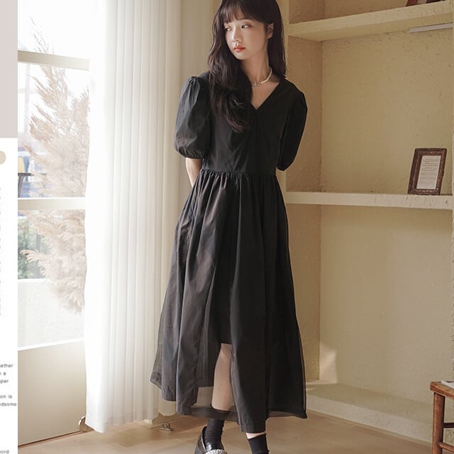 ワンピース レディース バックコンシャス バックシャン シースルー ハイウエスト ひざ下丈 ロングワンピ Vネック パフスリーブ ボリュームスリーブ シック モノトーン オケージョン おしゃれ かっこいい かわいい ブラック S/M/L/XL