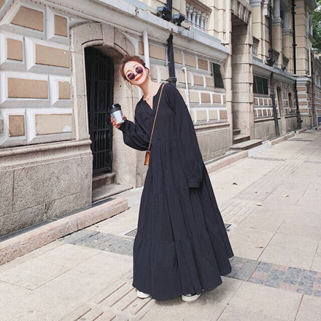 ワンピース レディース ロングワンピ オーバーシルエット 長袖 ボリュームスリーブ ティアード シンプル かわいい カジュアル おしゃれ ブラック S/M/L/XL/2XL