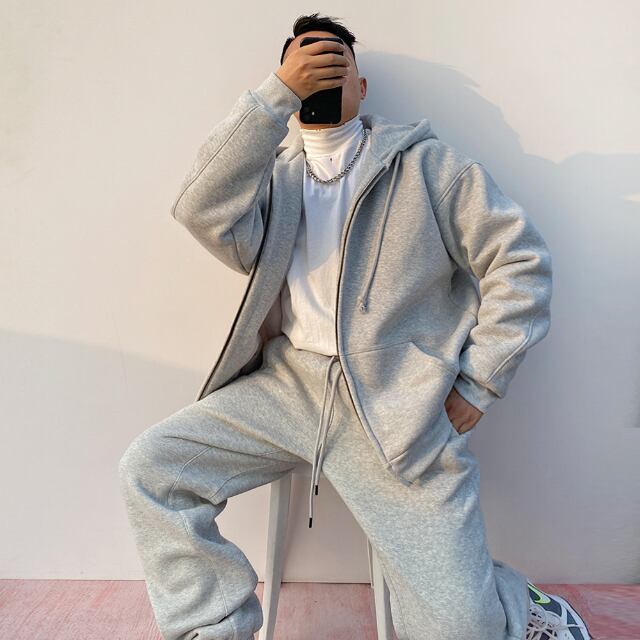 【予約販売】メンズ セットアップ 上下 長袖 フーディ パーカー ジップアップ グレー/カーキ/レッド/パープル/ブラウン ルーズ 男前 スエット 韓国 パンツ セット ジム カジュアル 部屋着 リラックス ルームウエア 韓国 トレンド 大きいサイズ M/L/XL/2XL