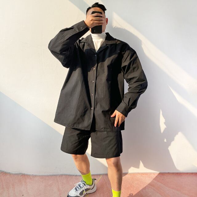 【予約販売】メンズ セットアップ 上下 長袖 シャツ ハーフパンツ 無地 ストリート ブラック/ベージュ/グリーン ブラック 韓国 トレンド カジュアル 春 大きいサイズ M/L/XL