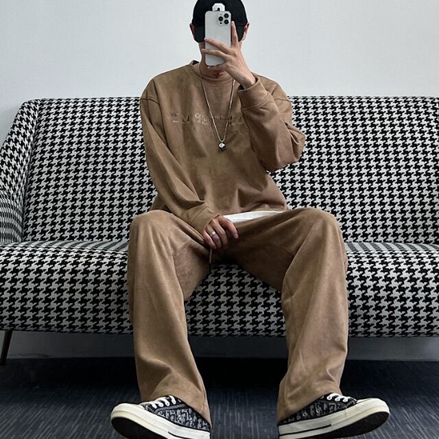 【予約販売】メンズ セットアップ 上下 長袖 刺繍 バッグデザイン グレー/ブラウン スエット ジップアップパーカー フード ルーズ 男前 スエット 韓国 パンツ セット ジム カジュアル 部屋着 リラックス ルームウエア 韓国 トレンド 大きいサイズ M/L/XL/2XL