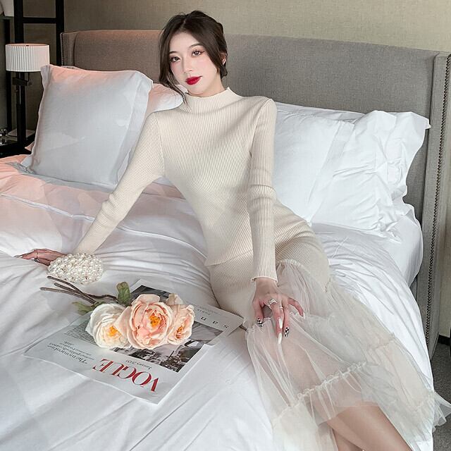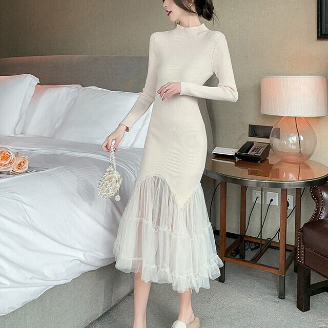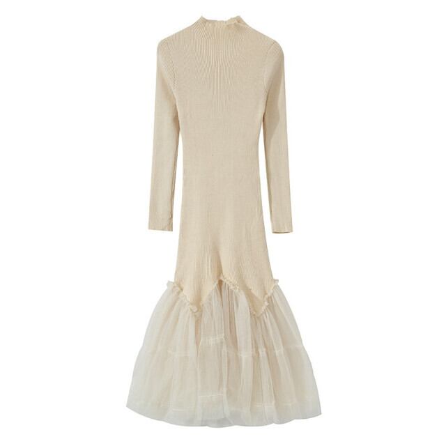 ワンピース レディース シースルー 異素材ミックス ニットワンピ ロングワンピ ハイネック フィッシュテール シック モノトーン チュール セクシー オケージョン おしゃれ かっこいい かわいい クリームホワイト オフホワイト