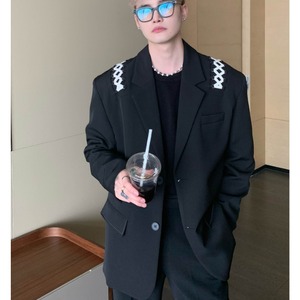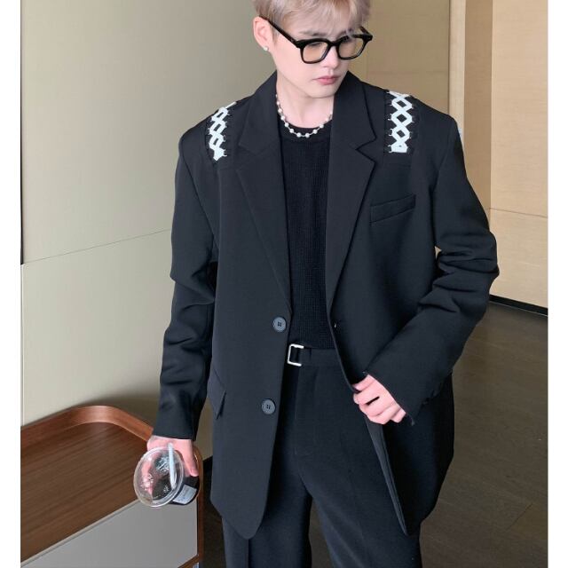 【予約販売】ジャケット 無地 レースアップ バイカラー モード メンズ ブラック ホワイト ドレスアップ シック 結婚式 パーティー こなれ感 お洒落 韓国 トレンド M/L/XL