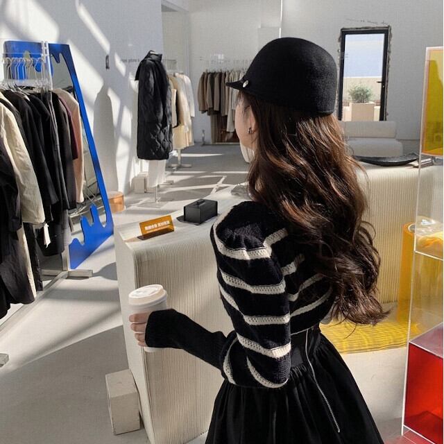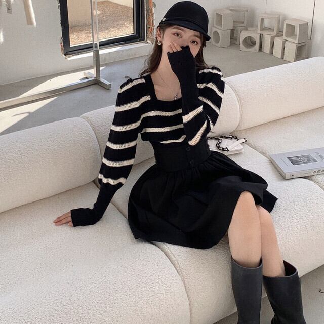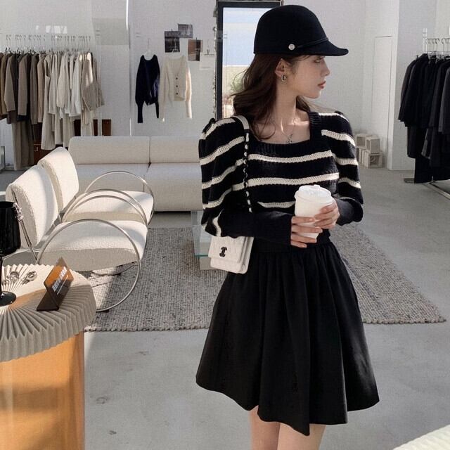 セットアップ レディース 2点セット ボーダー ニット ミニスカート ハイウエスト 長袖 パフスリーブ スクエアネック フレアスカート おしゃれ シンプル カジュアル かわいい ブラック S/M/L/XL