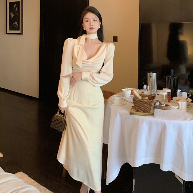 ワンピース レディース オケージョンワンピ 長袖 ロングワンピ パフスリーブ サテン リボン アプリコット パーティ 入学式 卒業式 謝恩会 S/M/L