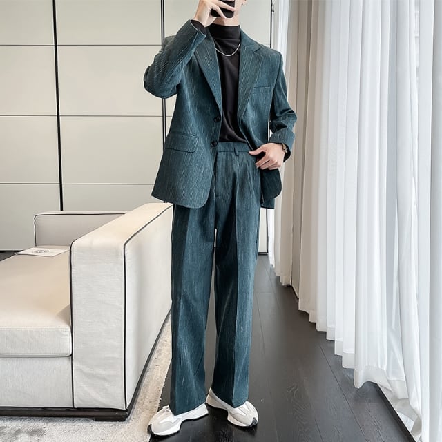 【予約販売】メンズ セットアップ スーツ ストライプ柄 シック 男前 ハンサム グリーン ジャケット パンツ セットアップ ビジネス 通勤 フォーマル パーティ 二次会 同窓会 結婚式 韓国 トレンド 春 秋 夏大きいサイズ M/L/XL/2XL
