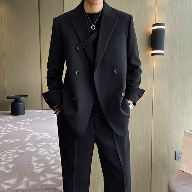 【予約販売】メンズ セットアップ スーツ 無地 シック 胸タグ 男前 ハンサム ダブル ブラック/ベージュ ジャケット パンツ セットアップ ビジネス 通勤 フォーマル パーティ 二次会 同窓会 結婚式 韓国 トレンド 春 秋 夏大きいサイズ M/L/XL/2XL