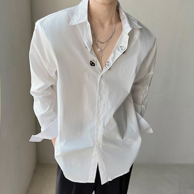 【予約販売】シャツ 長袖 シンプル 無地 個性的 モード モノトーン メンズ ホワイト ブラック カジュアル シック こなれ感 お洒落 韓国 トレンド 春 秋 M/L/XL