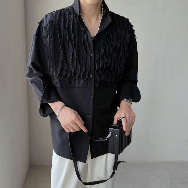 【予約販売】シャツ 長袖 シンプル 無地 シャーリング ベーシック モノトーン メンズ ホワイト ブラック カジュアル シック 結婚式 フォーマル こなれ感 お洒落 韓国 トレンド 春 秋 M/L/XL/2XL