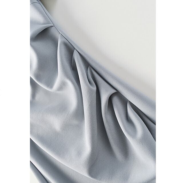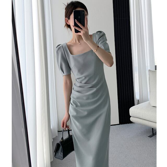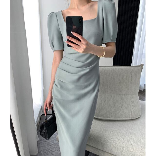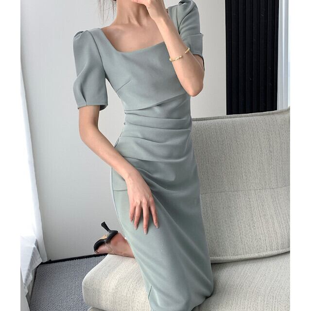ワンピース レディース ひざ下丈 タイト フォーマル オケージョンドレス 半袖 パフスリーブ スクエアネック シンプル おしゃれ 結婚式 パーティ フェミニン ブルー S/M/L/XL