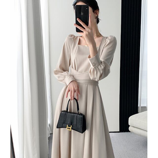ワンピース レディース ロングワンピ 上品 きちんと感 スクエアネック ウエストマーク パフスリーブ ロング丈 長袖 フレア Aライン おしゃれ かわいい フェミニン お呼ばれ 卒業式 入学式 謝恩会 パーティ 結婚式 カーキ S/M/L/XL