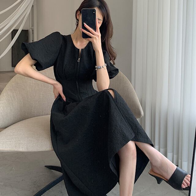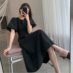 ワンピース レディース ロングワンピ 上品 きちんと感 スリット ハイウエスト パフスリーブ ロング丈 半袖 フレア Aライン おしゃれ かわいい フェミニン 光沢感 お呼ばれ 卒業式 入学式 謝恩会 パーティ 結婚式 ブラック M