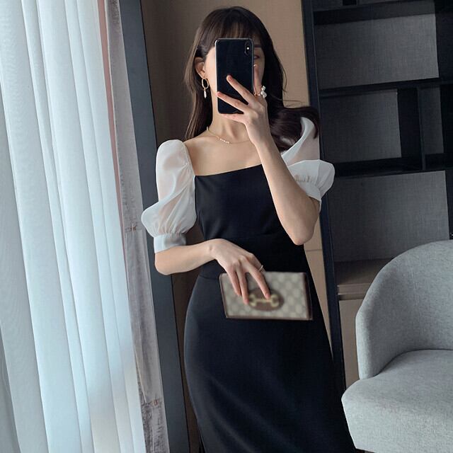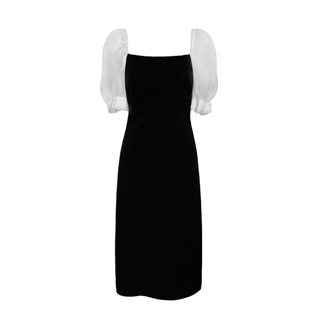 ワンピース レディース ロングワンピ 上品 きちんと感 ハイウエスト パフスリーブ ひざ下丈 五分袖 フレア Aライン おしゃれ かわいい スリット スリム フェミニン シースルー お呼ばれ 卒業式 入学式 謝恩会 パーティ 結婚式 バイカラー ブラック S/M/L/XL