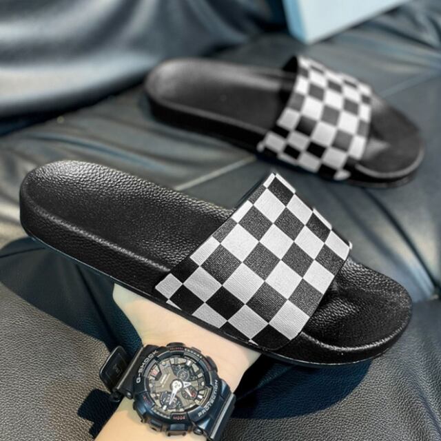 【予約販売】サンダル メンズ フラット スリッパ ブラウン/ブラック×ホワイト ブロック柄 カジュアル ビーチサンダル 靴 お洒落 ストリート 旅行 韓国 24.5cm/25cm/25.5cm/26cm/26.5cm/27cm/27.5cm