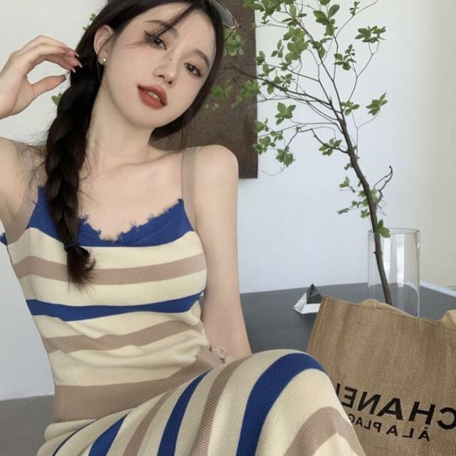 ワンピース レディース ロングワンピ ストライプ マルチボーダー おしゃれ 青 ベージュ キャミワンピ 細見え タイト 春夏 S/M/L