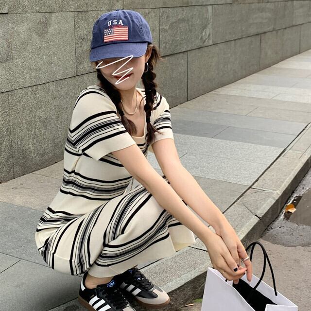 ワンピース レディース ひざ下丈 半袖 スクエアネック ボーダー タイト スリム カジュアル おしゃれ かわいい ベーシック ブラック/アプリコット