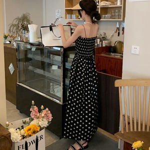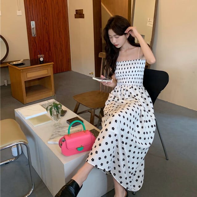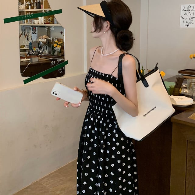 ワンピース レディース ロングワンピ ロング丈 小花柄 フラワー かわいい スイート フレア キャミワンピ 肌見せ リゾート 旅行 ビーチ プール 春夏 ブラック/ホワイト