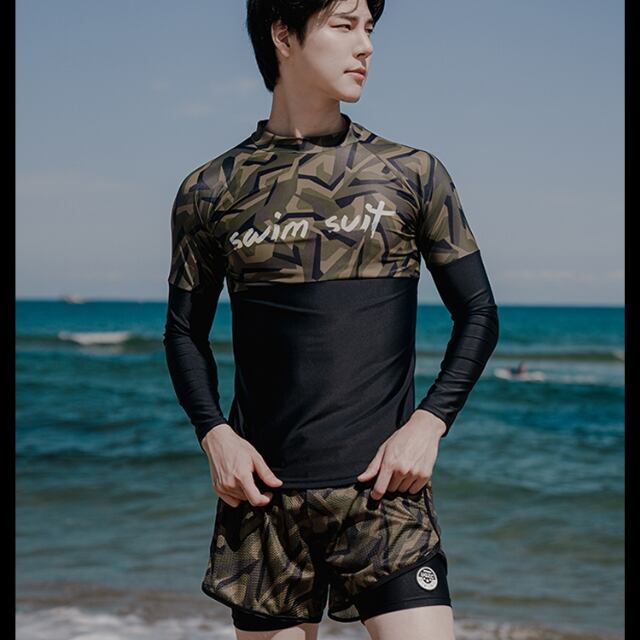【予約販売】水着 カップル水着 4点セット ペアルック メンズ レディース 迷彩 カモフラージュ柄 ブラック ラッシュガード 長袖 海水パンツ 海パン ペア サウナ 温泉 プール ペア水着 恋人 おそろい お揃い ジム ワークアウト M/L/XL/2XL/3XL