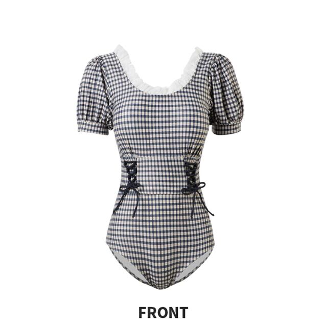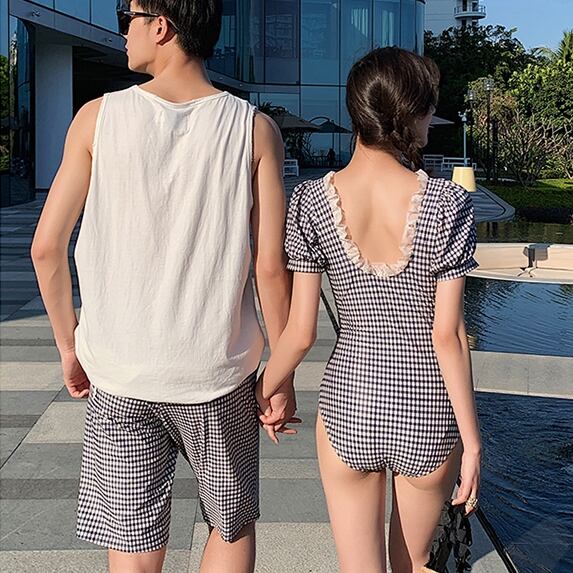 【予約販売】水着 カップル水着 2点セット ペアルック メンズ レディース ブラック ギンガムチェック柄 フラワー柄 総柄 ワンピース水着 フリル 海水パンツ 海パン ペア サウナ 温泉 プール ペア水着 恋人 おそろい お揃い M/L/XL