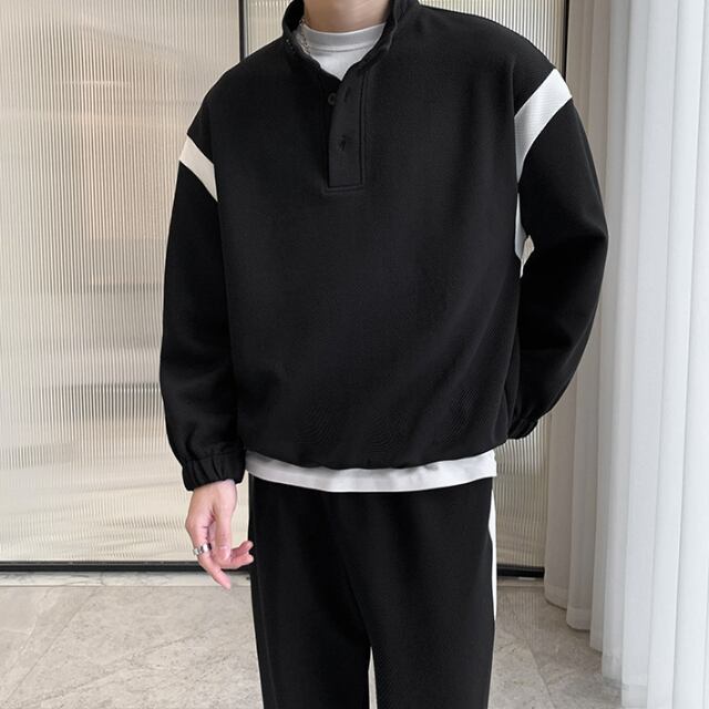 【予約販売】メンズ セットアップ 上下 パンツ 長袖 無地 バイカラー ライン ブラック ストリート カジュアル 春夏 韓国 トレンド こなれ感 M/L/XL/2XL/3XL