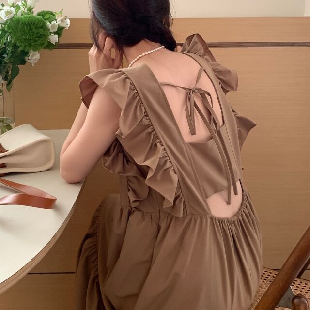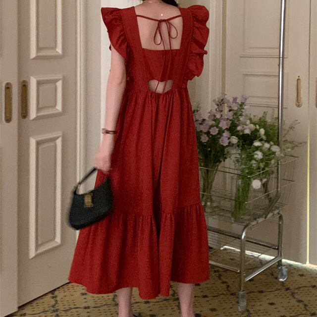 【予約販売】ワンピース レディース ロングワンピース レッド/ブラック/ベージュ フリル袖 背中見せ ドレス きれいめ ワンピ 大人可愛い エレガント おしゃれ こなれ感 韓国 春 夏 トレンド フリー