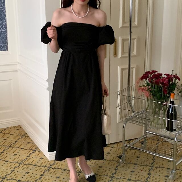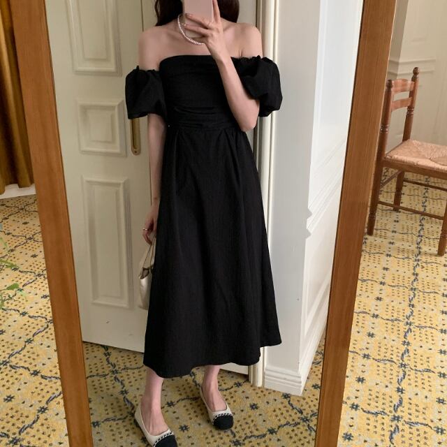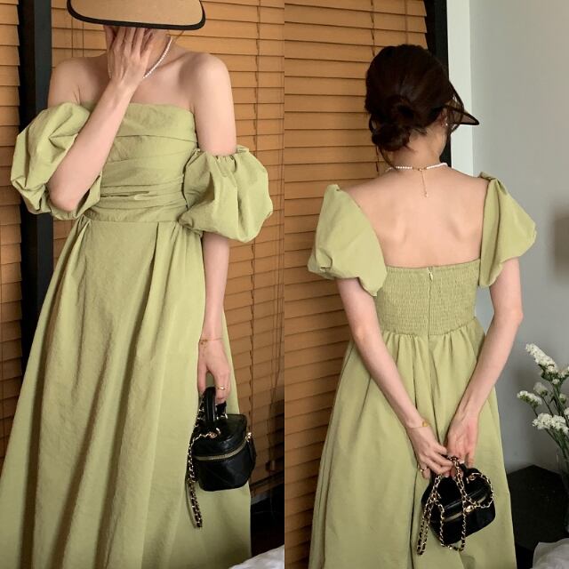 【予約販売】ワンピース レディース ロングワンピース オフショル ブラック ホワイト グリーン オフショルダー ボリューム袖 ドレス きれいめ ワンピ 大人可愛い エレガント おしゃれ こなれ感 韓国 春 夏 トレンド フリー