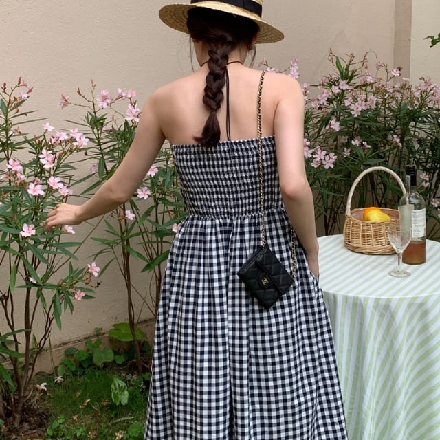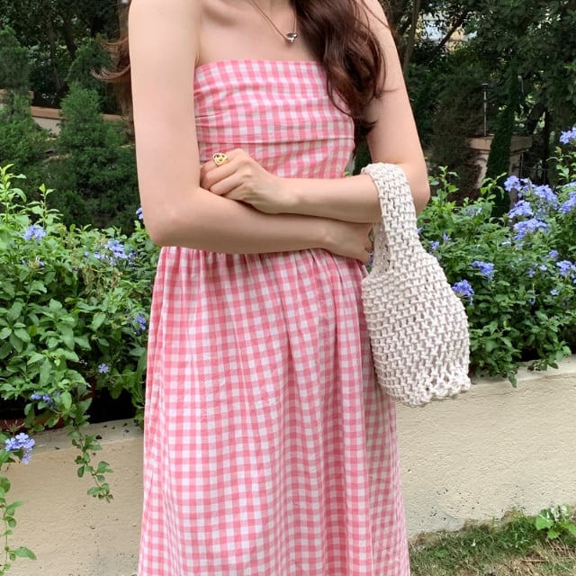 【予約販売】ワンピース レディース ロングワンピース ギンガムチェック柄 ベアトップ ネイビー ピンク Aライン ドレス きれいめ ワンピ 大人可愛い エレガント おしゃれ こなれ感 韓国 春 夏 トレンド フリー
