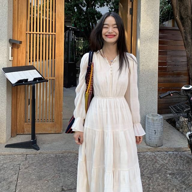 【予約販売】ワンピース レディース ロングワンピース 長袖 ブラック/オフホワイト/カーキ シフォン 透け感 シアー ボリューム袖 ドレス きれいめ ワンピ 大人可愛い ドレス 結婚式 エレガント おしゃれ こなれ感 韓国 春 夏 秋 トレンド S/M/L