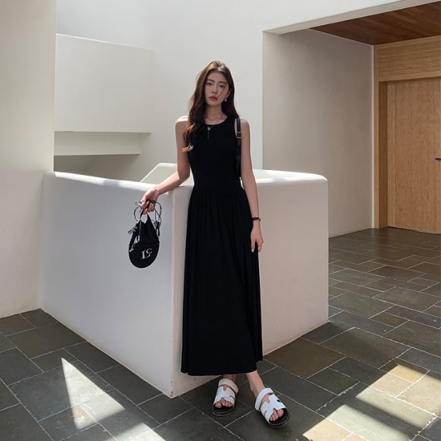 【予約販売】ワンピース レディース ロングワンピース ノースリーブ 美ライン グレー ブラック 体型カバー Aライン ワンピ 大人可愛い シンプル エレガント おしゃれ こなれ感 韓国 旅行 バカンス 春 夏 トレンド S/M/L