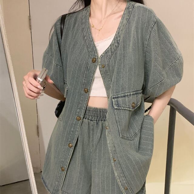 【予約販売】セットアップ レディース ショート デニム パンツ 半袖 ストライプ柄 ツーピース こなれ感 大人可愛い きれいめ 楽ちん エレガント おしゃれ 旅行 韓国 春 夏 秋 トレンド フリー