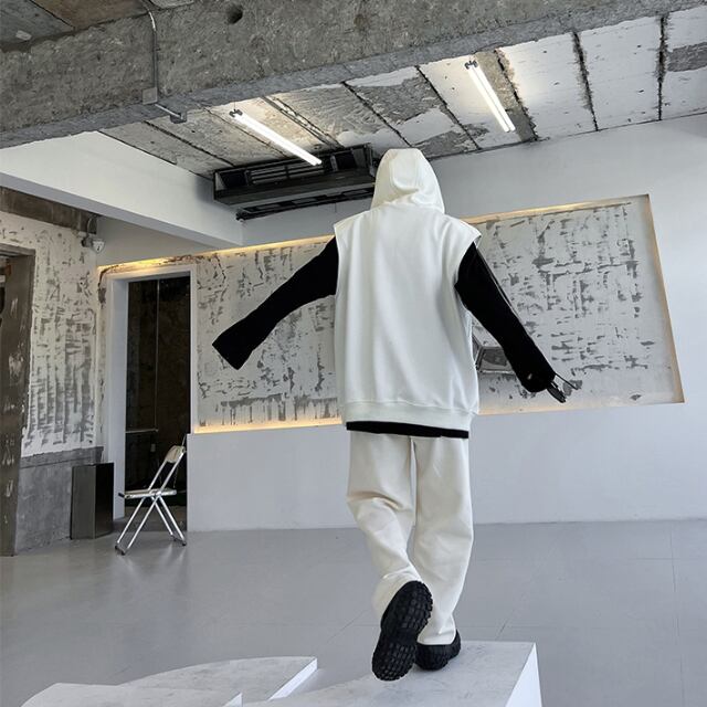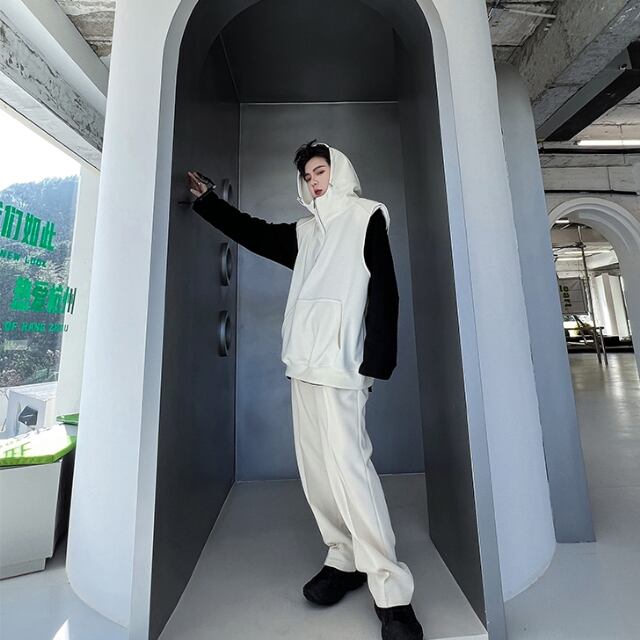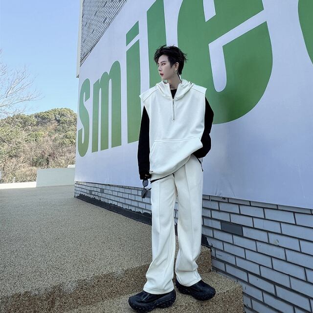 【予約販売】メンズ セットアップ 上下 プルオーバー フード 無地 シンプル スエット ノースリーブ パンツ ジップデザイン ストリート ブラック グレー ホワイト 韓国 カジュアル 春 夏 秋 M/L/XL