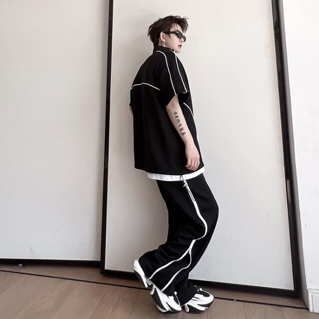 【予約販売】メンズ セットアップ 上下 無地 シンプル ライン スエット 半袖 パンツ ジップデザイン ストリート ブラック ベージュ 韓国 カジュアル 春 夏 秋 M/L/XL
