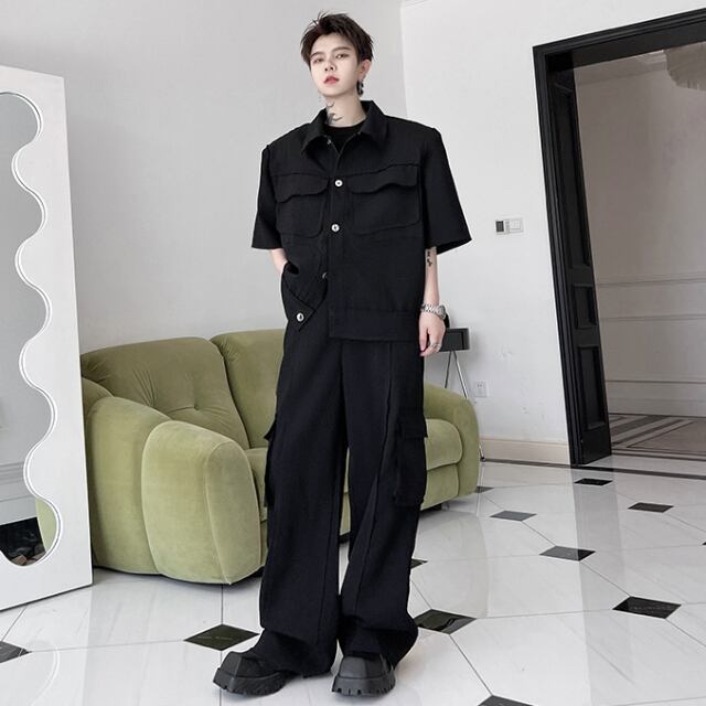 【予約販売】メンズ セットアップ 上下 パンツ 半袖 ポケット 無地 ブラック ホワイト ストリート カジュアル 春夏 韓国 トレンド こなれ感 M/L/XL
