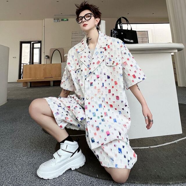 【予約販売】メンズ セットアップ 上下 パンツ 半袖 シャツ 総柄 ハーフパンツ ブラック ホワイトー ストリート カジュアル 春夏 韓国 トレンド こなれ感 M/L/XL