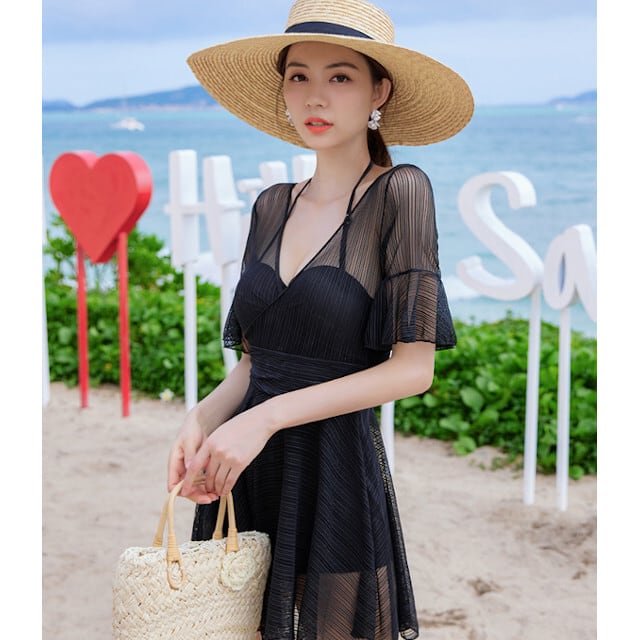 水着 レディース ワンピース レイヤード シースルー Vネック 透け感 体型カバー 夏 無地 フェミニン かわいい おしゃれ ビーチ プール ブラック/グリーン 大きいサイズ M/L/XL/2XL/3XL