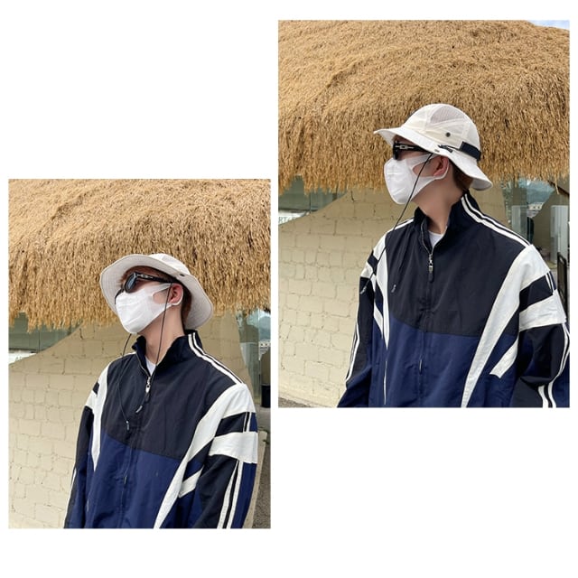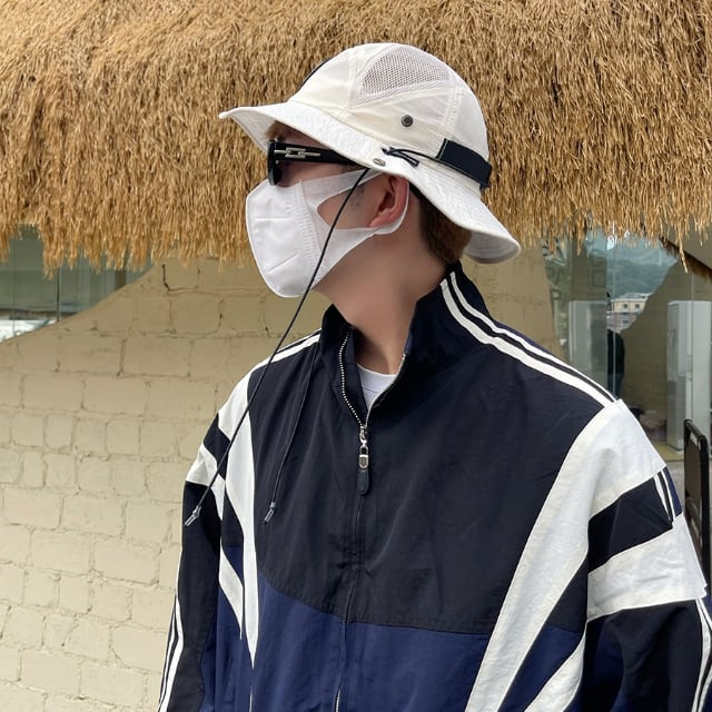 【予約販売】ハット メンズ ツバ広 帽子 ワンポイント メッシュ アウトドア キャンプ 屋外 日焼け防止 UV対策 紫外線 ブラック オフホワイト 登山 釣り ストリート スポーティー こなれ感 お洒落 韓国 トレンド