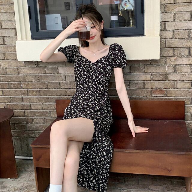ワンピース レディース ドレス スリット パフスリーブ ボリューム袖 セクシー 小花柄 可愛い おしゃれ フェミニン デート お出かけ 春夏 旅行 ブラック S/M/L/XL/2XL/3XL