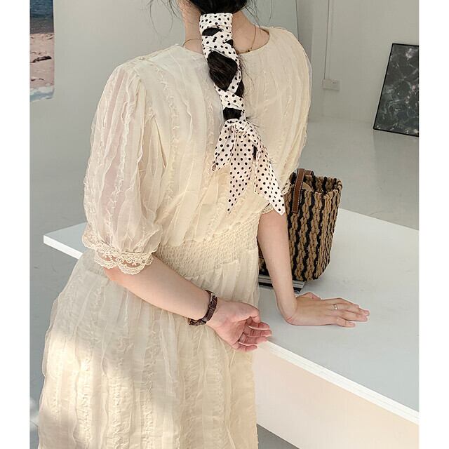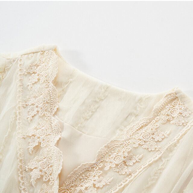 ワンピース レディース ロングワンピ レース パールボタン クラシカル パフスリーブ レトロ Vネック フェミニン 可愛い おしゃれ フェミニン デート お出かけ 春夏 旅行 アプリコット M/L