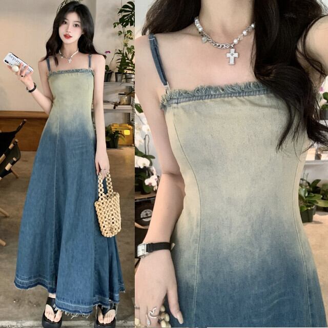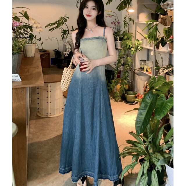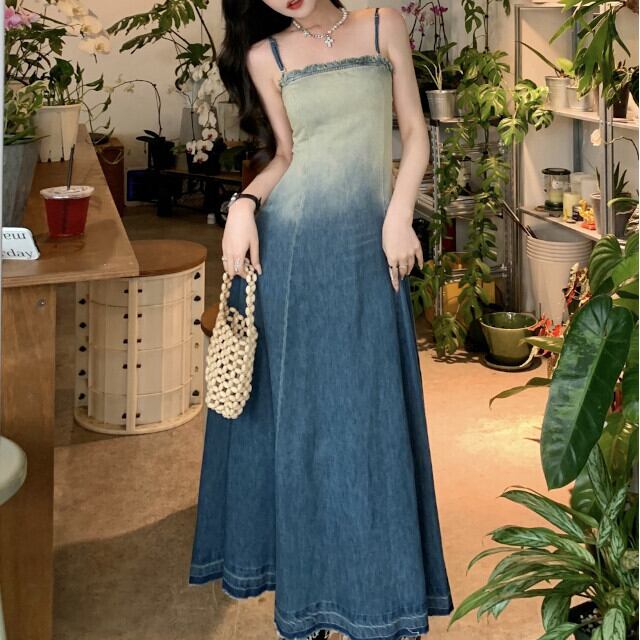 ワンピース レディース ロングワンピ キャミワンピ ロング丈 デニム グラデーション 春夏 カジュアル おしゃれ 旅行 ビーチ リゾート レジャー ブルー S/M/L