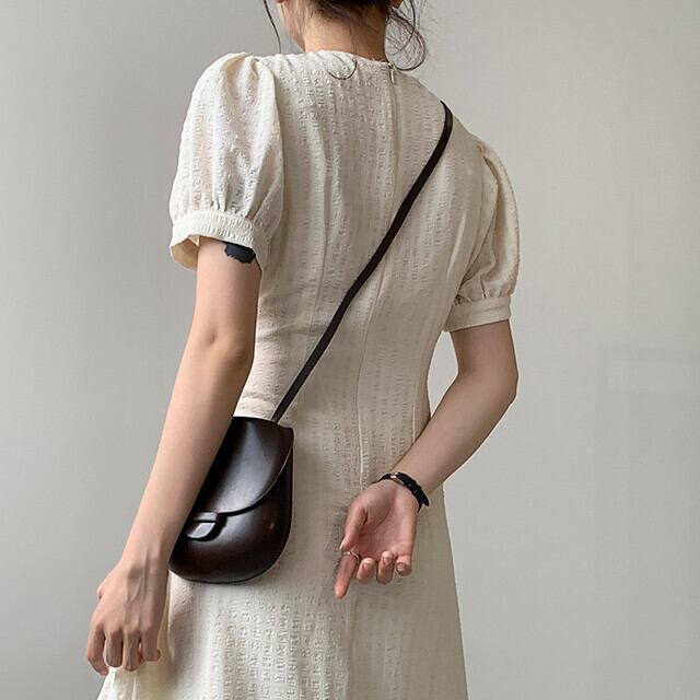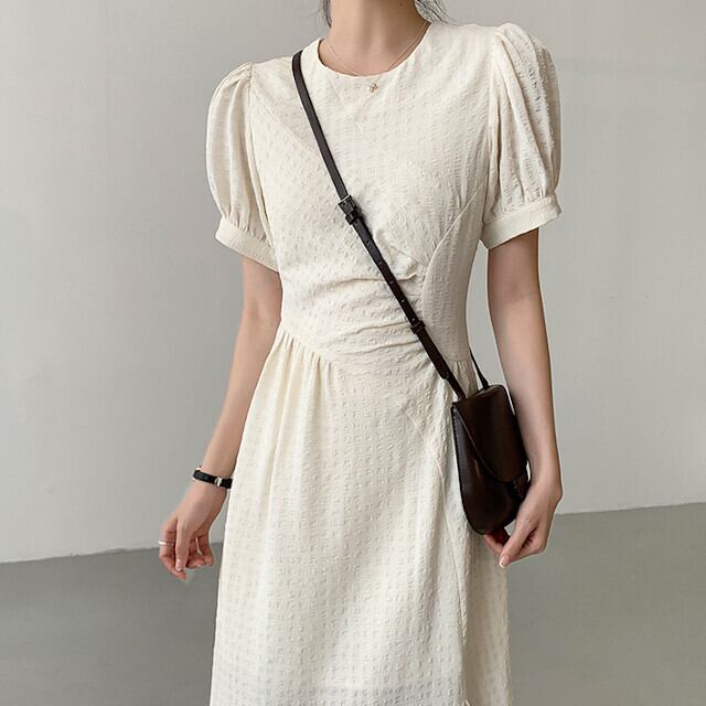 ワンピース レディース ハイウエスト パフスリーブ 半袖 ひざ下丈 ミディワンピ 上品 デート お呼ばれ お出かけ 旅行 春夏 アプリコット S/M/L/XL