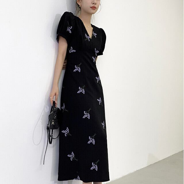 ワンピース レディース ハイウエスト Vネック パフスリーブ 花柄 半袖 ひざ下丈 ミモレ丈 ミディワンピ 上品 デート お呼ばれ お出かけ 旅行 春夏 ブラック S/M/L/XL