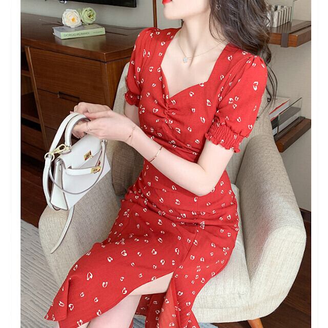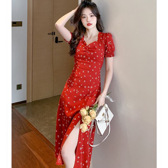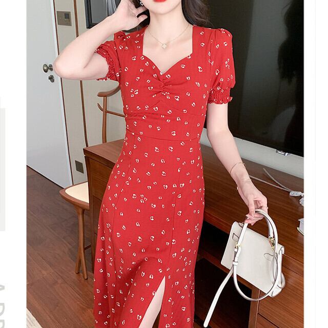 ワンピース レディース ミディ丈 ひざ下丈 スリット セクシー おしゃれ ダイヤモンドネック パフスリーブ 花柄 フラワー 旅行 お出かけ デート 可愛い レッド/ブラック S/M/L/XL