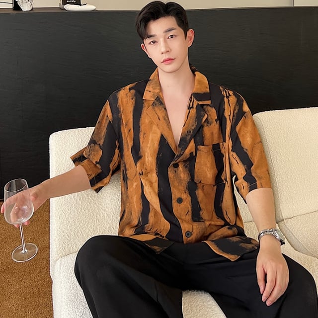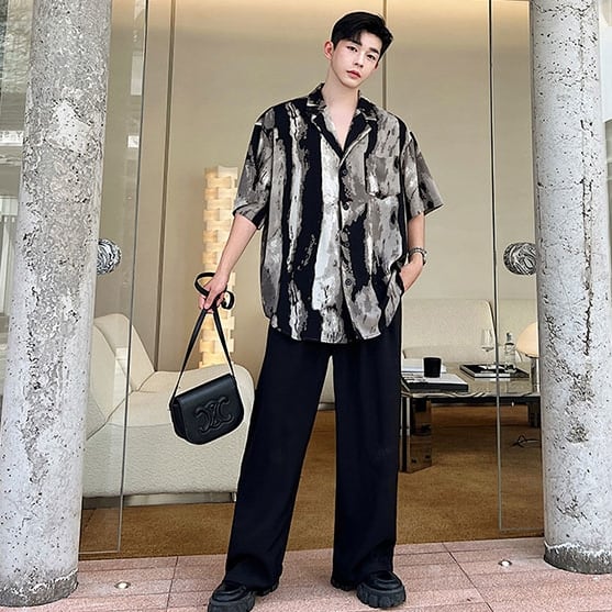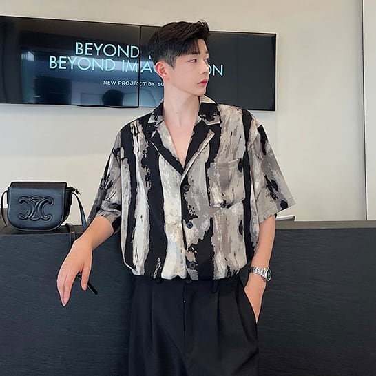 【予約販売】シャツ 半袖 メンズ 開襟 総柄 オーバーサイズ ワイルド グレー ブラウン 派手 インパクト カジュアル シンプル こなれ感 お洒落 韓国 トレンド 春 夏 秋 M/L/XL